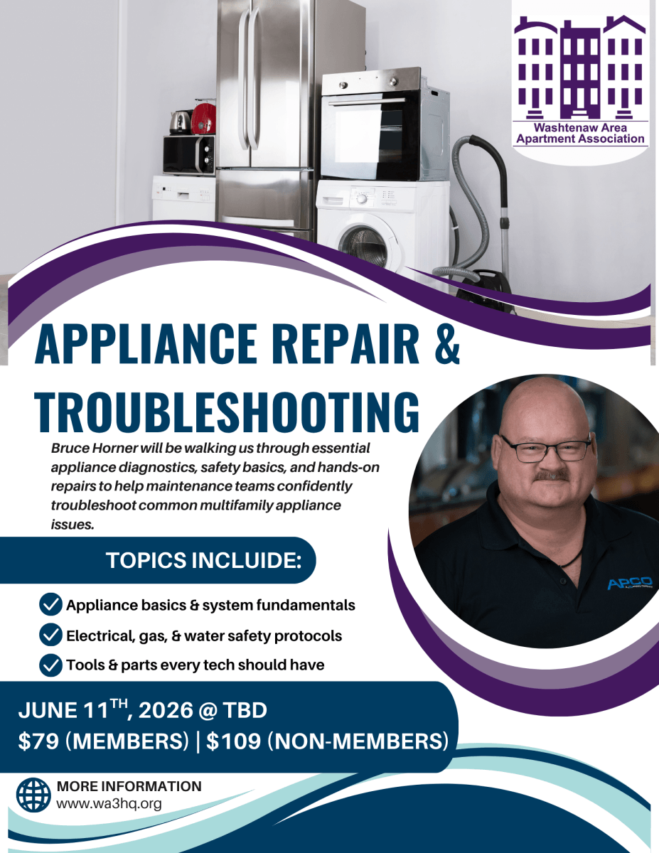 Bruce Horner will be walking us through the essential skills every maintenance technician needs to confidently diagnose and repair the most common appliances found in multifamily housing. This hands‑on session covers practical troubleshooting steps, safety basics, and real‑world repair techniques for refrigerators, ranges, dishwashers, washers, and dryers.