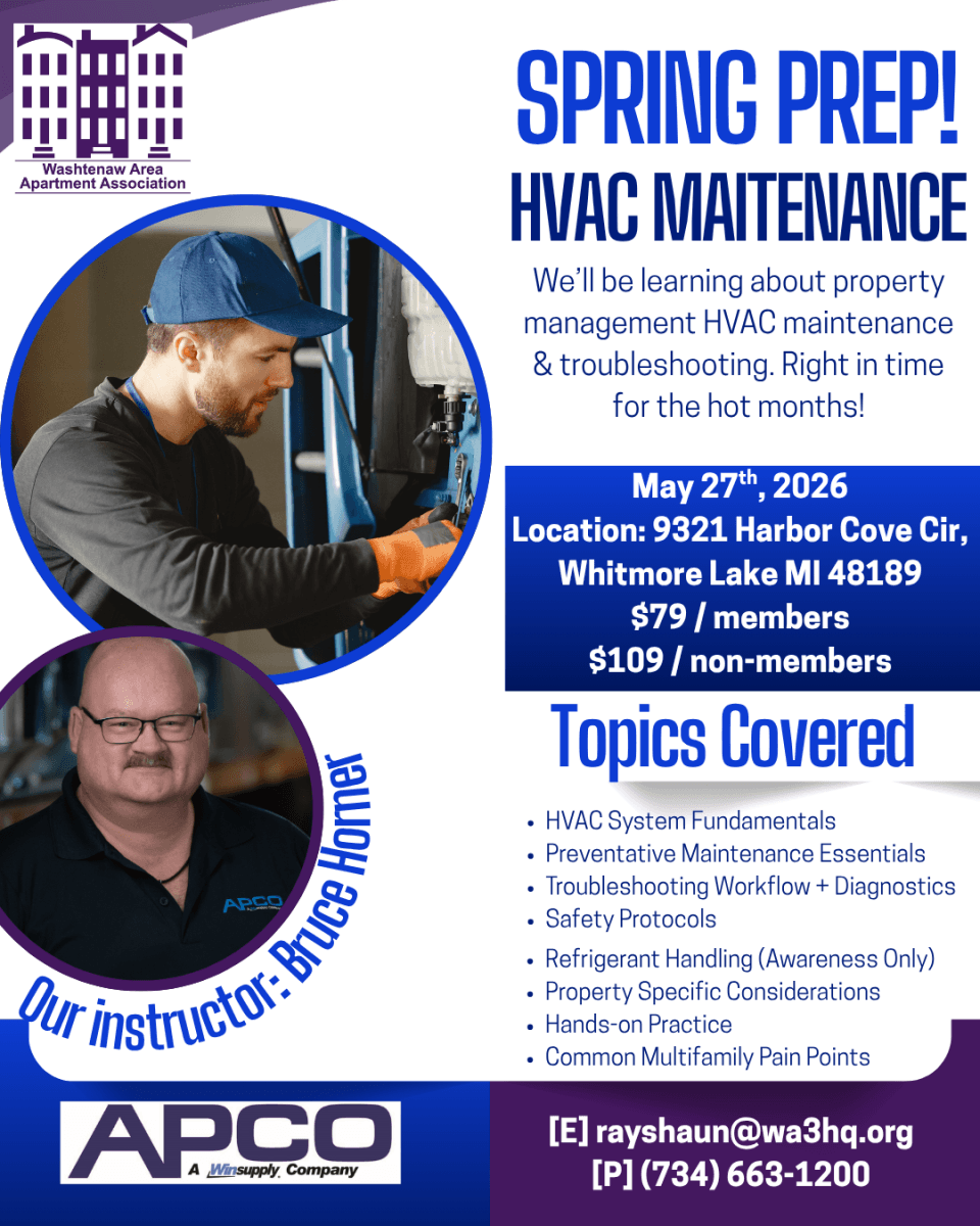 Join us for a hands‑on, practical HVAC training designed specifically for multifamily maintenance professionals. This session covers the essential skills your team needs to confidently maintain, diagnose, and resolve common heating and cooling issues — reducing downtime, preventing resident complaints, and extending the life of your equipment.